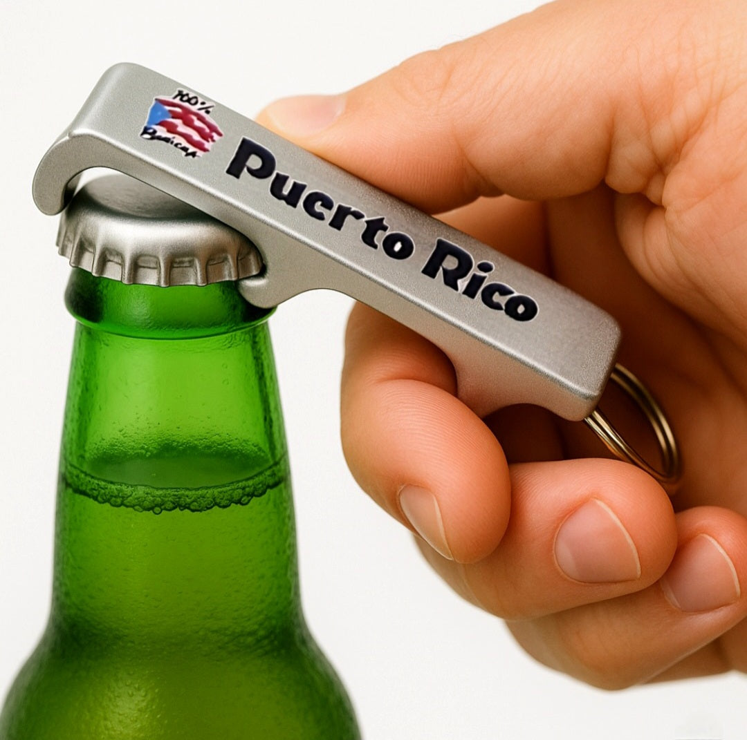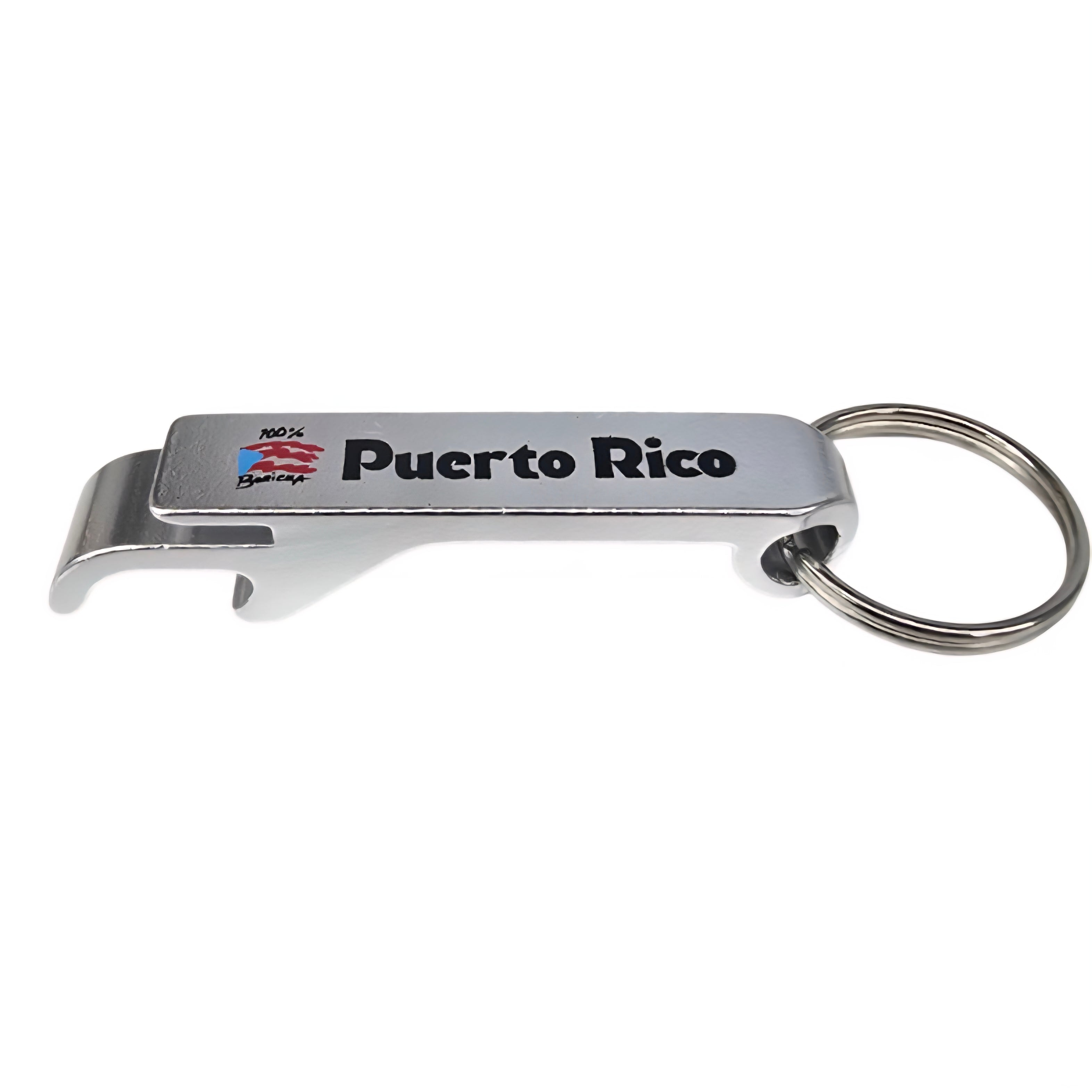 This metal Puerto Rico-themed bottle/soda opener keychain is made of sturdy metal material. The design features the text "Puerto Ri...