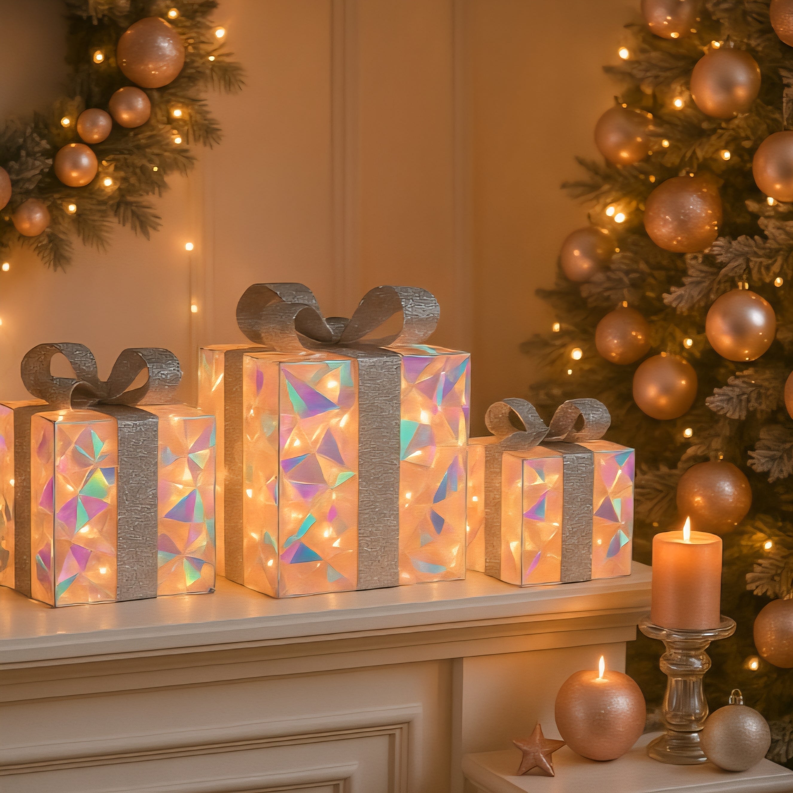 Set de 3 Regalos de Navidad con Luces - Tornasol con Lazo Plateado