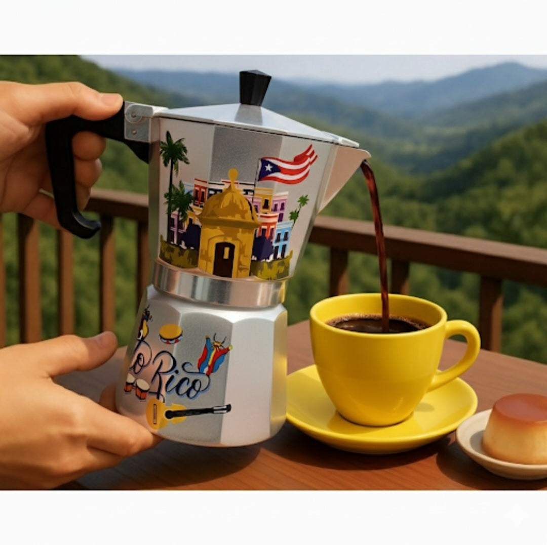 Esta cafetera espresso o greca ha sido diseñada para evocar aquellos recuerdos de las mañanas en Puerto Rico junto a un buen café. Un bonito diseño que incorpora instrumentos musicales, vistas de El Viejo San Juan y Vejigantes... ¡Qué gran regalo para los amantes de la música puertorriqueña y de El Viejo San Juan!