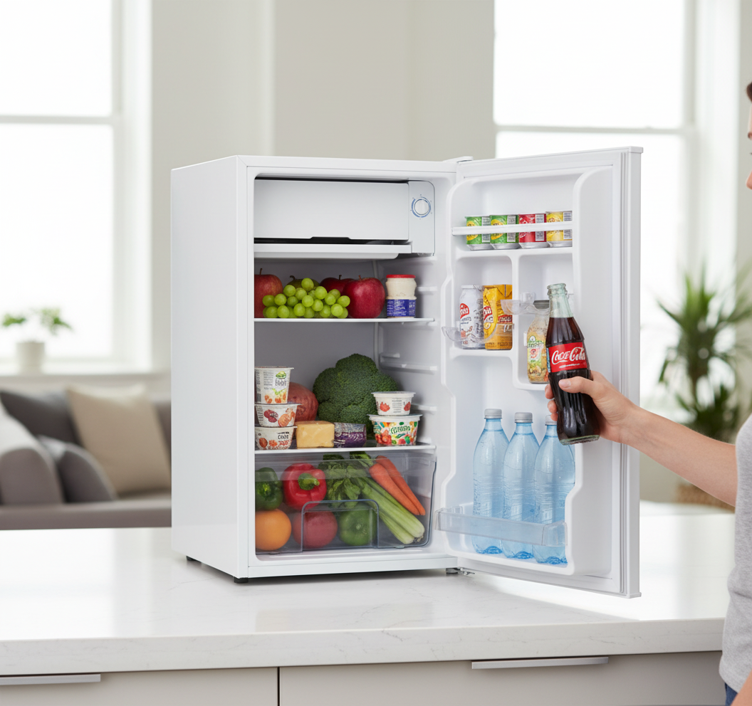 Mini nevera de gran capacidad de 3.2 pies cúbicos con congelador que contiene una sección de refrigeración de 2.9 pies cúbicos (25℉~44℉) y una sección de microcongelador de 0.3 pies cúbicos (23℉~41℉).