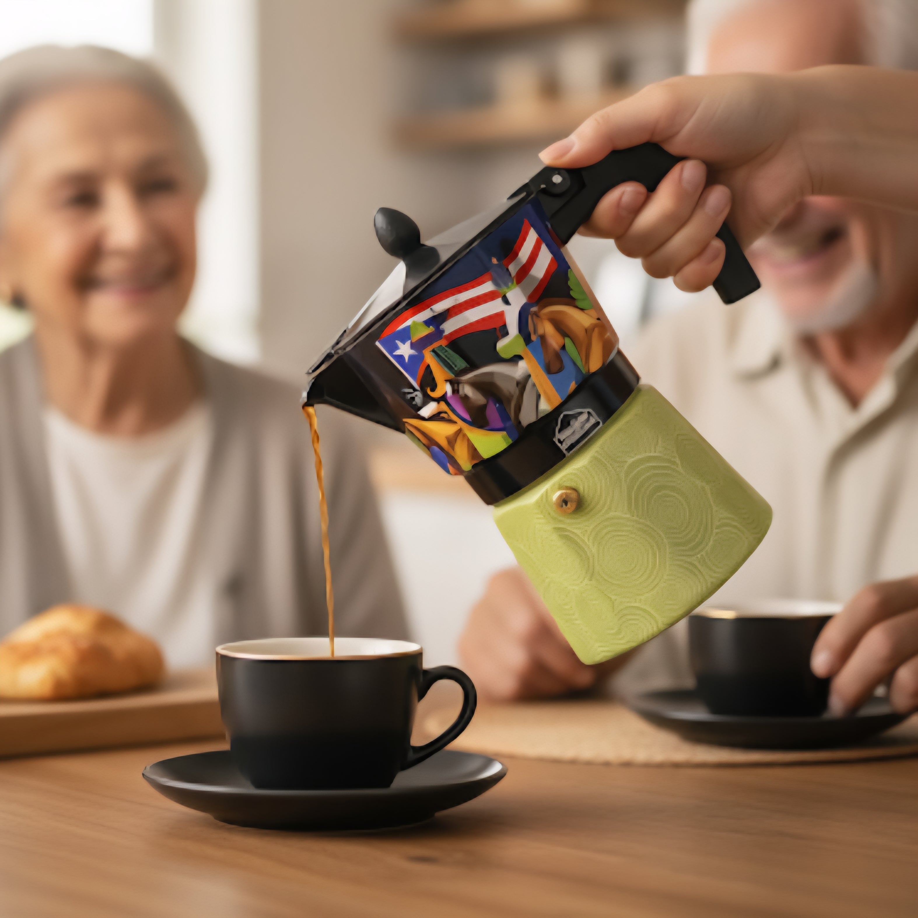 Una cafetera o Greca muy especial de edición limitada, que ha sido diseñada para evocar la tradición de Los 3 Reyes Magos. Un gran regalo para los que viven fuera de Puerto Rico o para los que viven en la isla y son devotos de esta hermosa tradición.