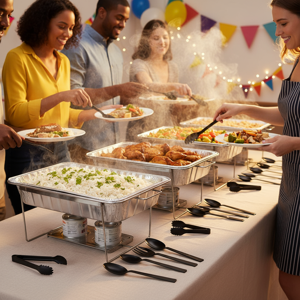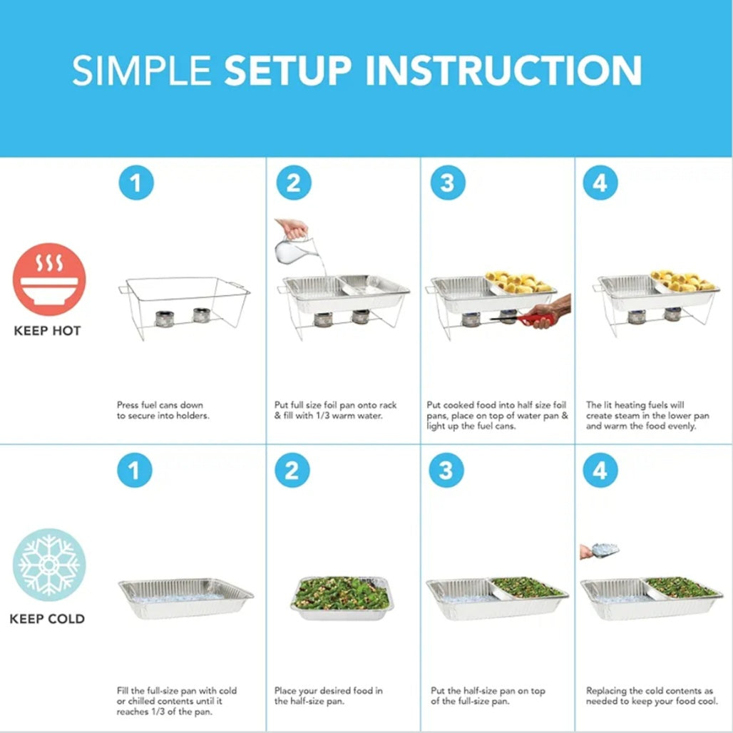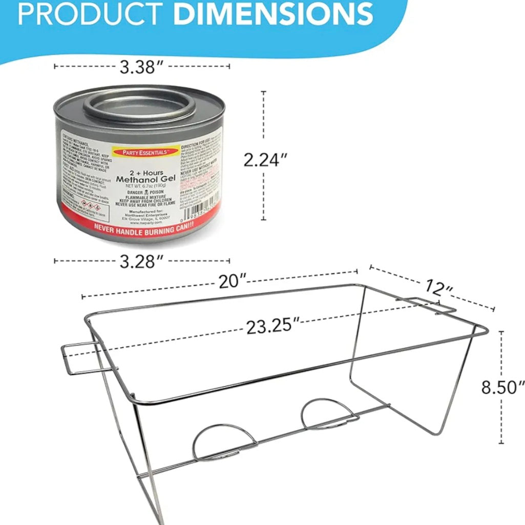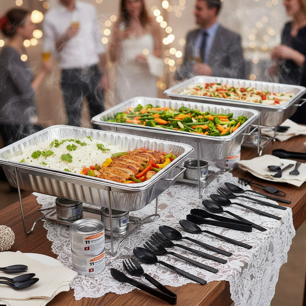 Soportes para calentar, bandejas de aluminio de tamaño completo y medio tamaño, tapas, combustible en gel para calentar, cucharas para servir, tenedores y pinzas.