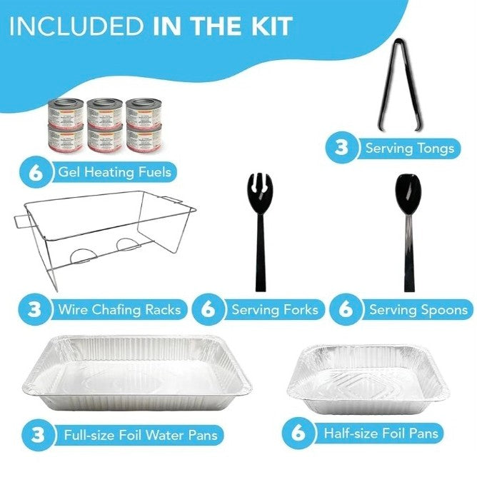 El kit incluye 6 latas de combustible, 6 cucharas para servir, 6 tenedores para servir, 3 pinzas, 3 soportes para calentar, 3 bandejas de tamaño completo para agua y 6 bandejas de medio tamaño para comida.