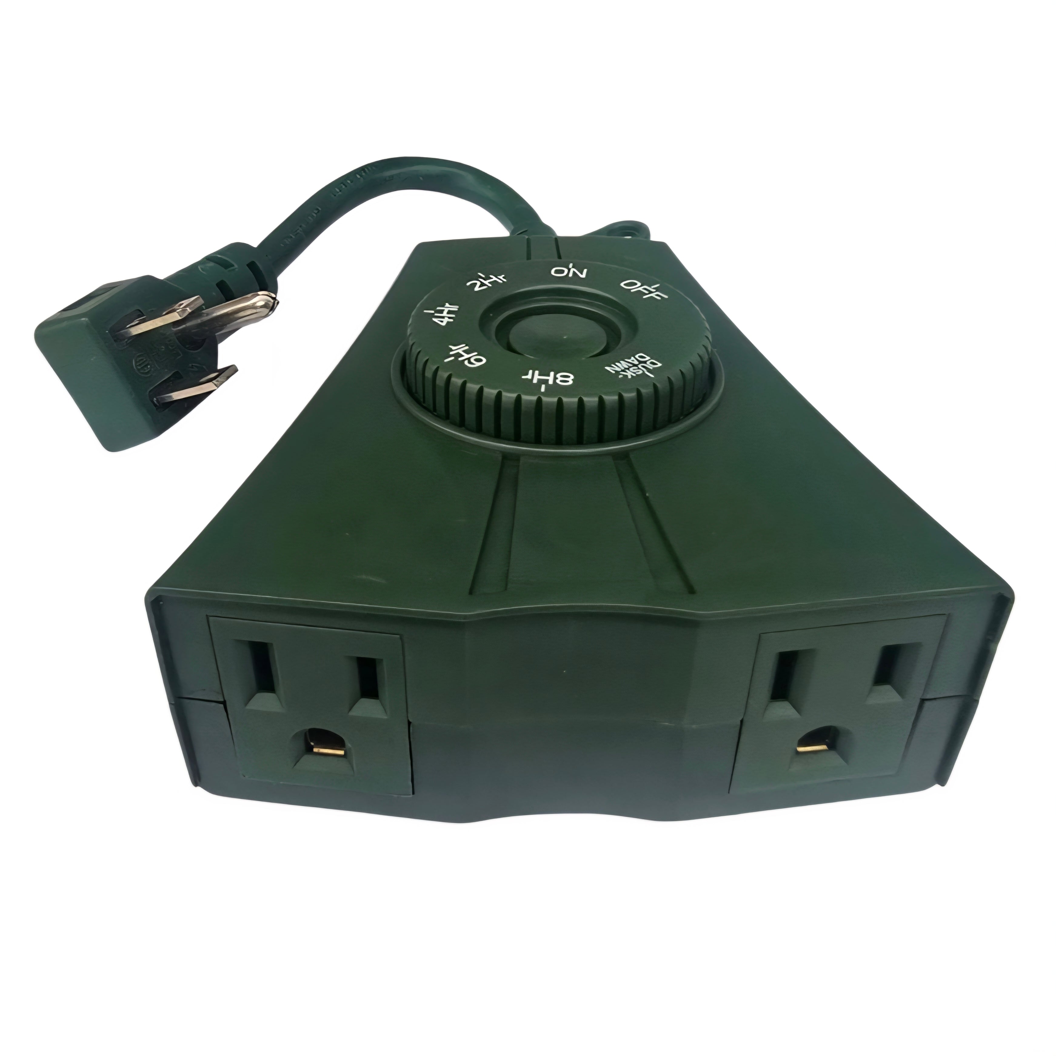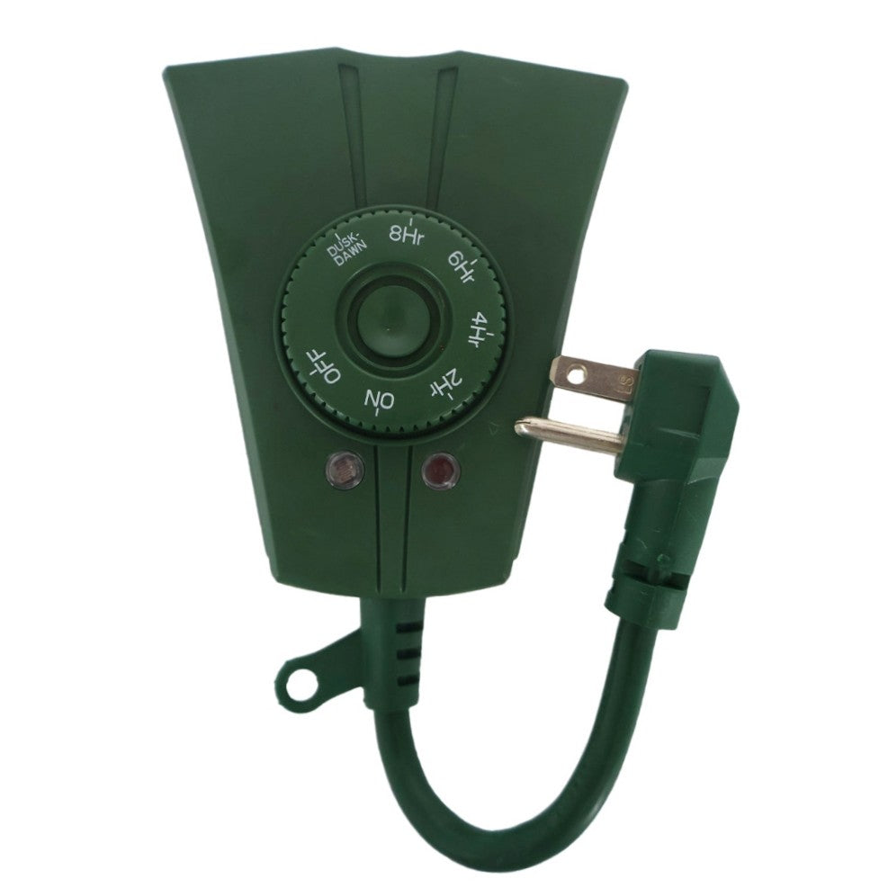 Multi-functional outdoor timer with two (2) outlets. Include 7 countdown functions (ON at dusk, OFF after 2h/4h/6h/8h), 2 switch functions (always ON/OFF),1 DUSK function (ON at dusk, OFF at dawn), repeats daily.