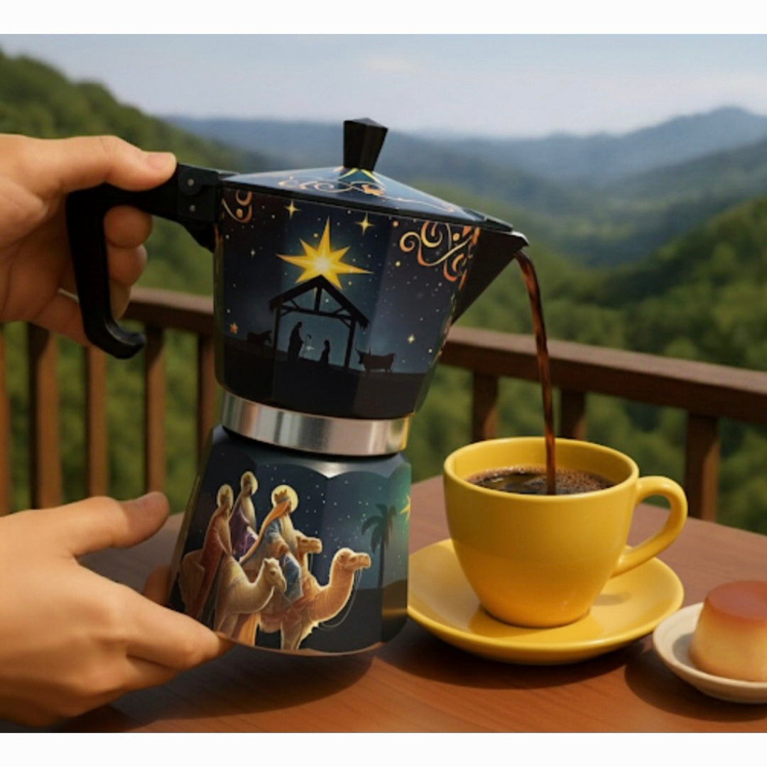 Esta cafetera espresso o greca, ha sido diseñada para evocar la tradición y el valor cultural de los Reyes Magos. ¡Qué gran regalo para quienes viven fuera de Puerto Rico o para quienes viven en la isla y son devotos de esta hermosa tradición!