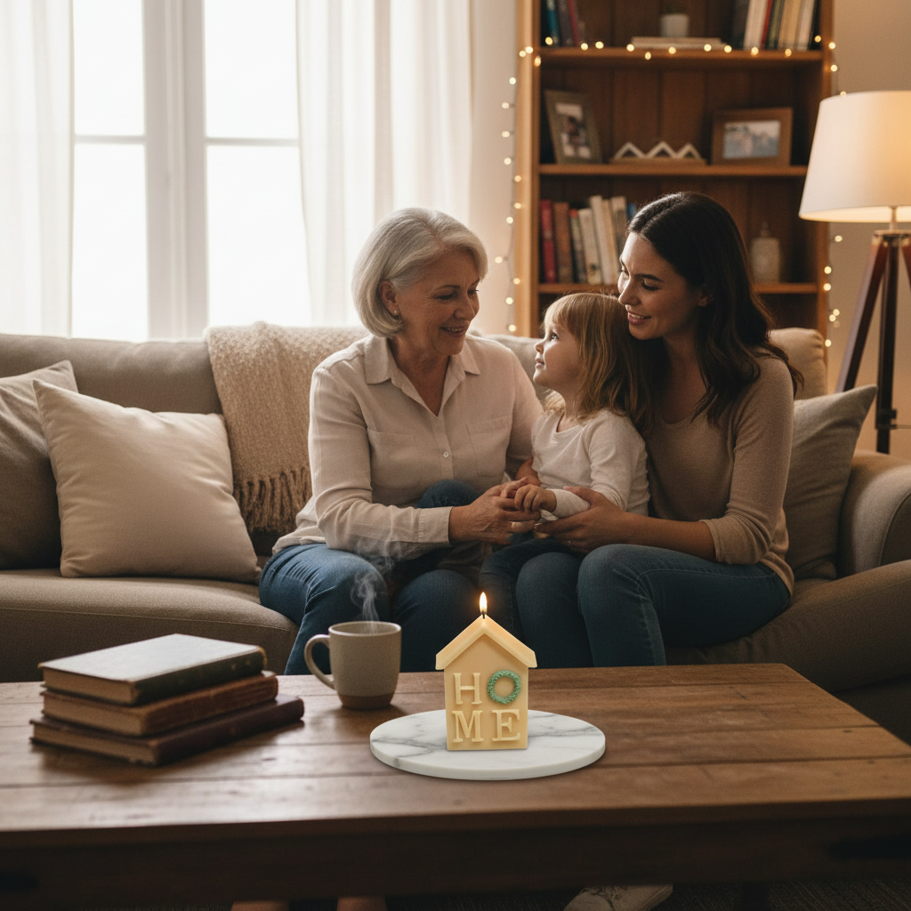 This pillar candle designed in the shape of a little house, adding a warm and cozy touch to any space. It has the word "Home" embossed, where the letter "O" becomes a delicate Christmas wreath. Perfect for creating a festive and homely atmosphere during the season. Ideal for those who want to fill their home with comfort and Christmas spirit with an elegant and simple detail.