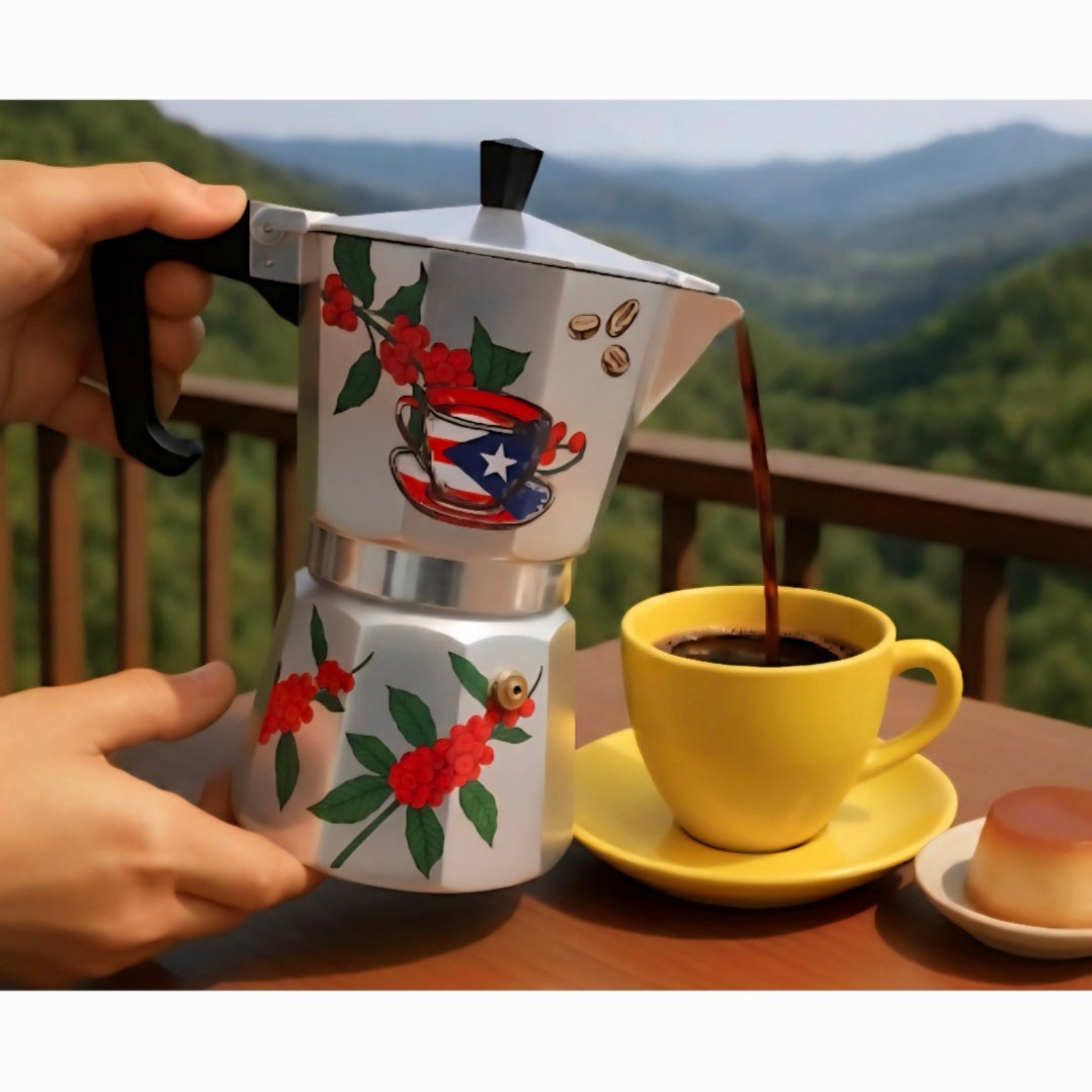 This espresso coffee maker or "Greca", has been designed to evoke memories of mornings in Puerto Rico accompanied by a good cup of coffee.  A beautiful design that incorporates beans of coffee, a coquí, and a cup of coffee with the Puerto Rican flag...What a great gift for those who love coffee!