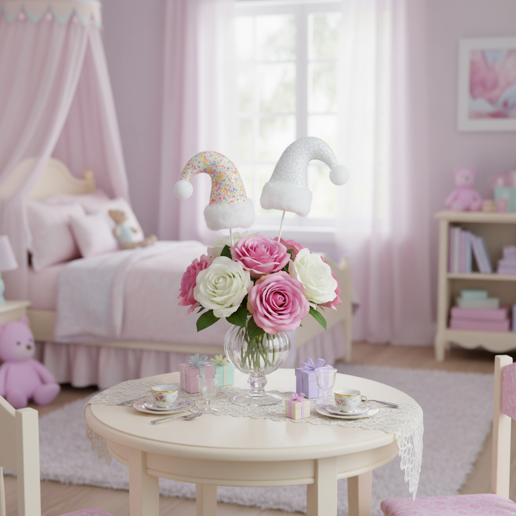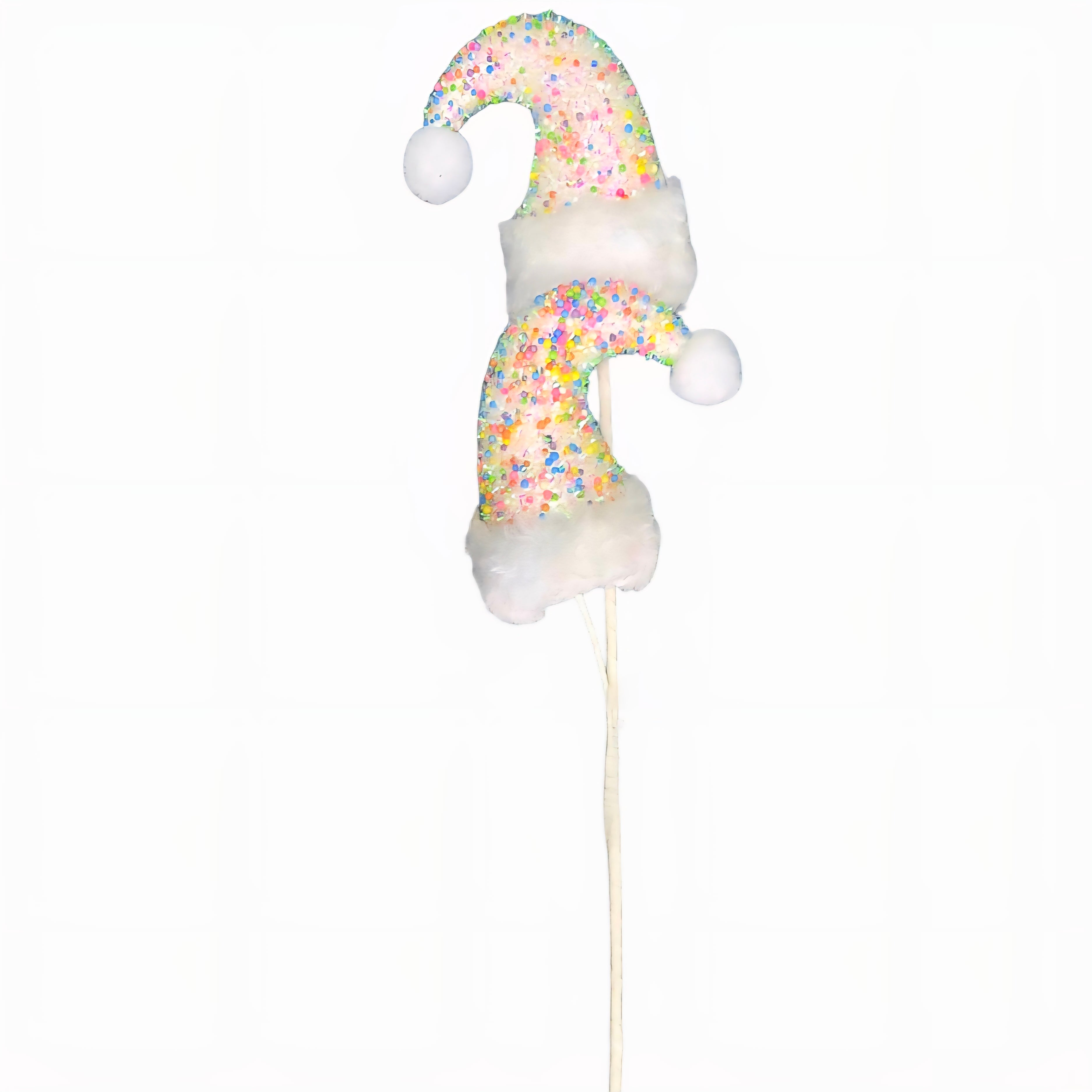 These Santa Hats picks are suitable for Christmas tree ornaments, holiday centerpieces, New Year events or for any home decor. A fun way to add a touch of sparkle and beauty. Two (2) colors to choose from: White Chenille with Iridescent Fibers and White Chenille with Foam Sprinkles.