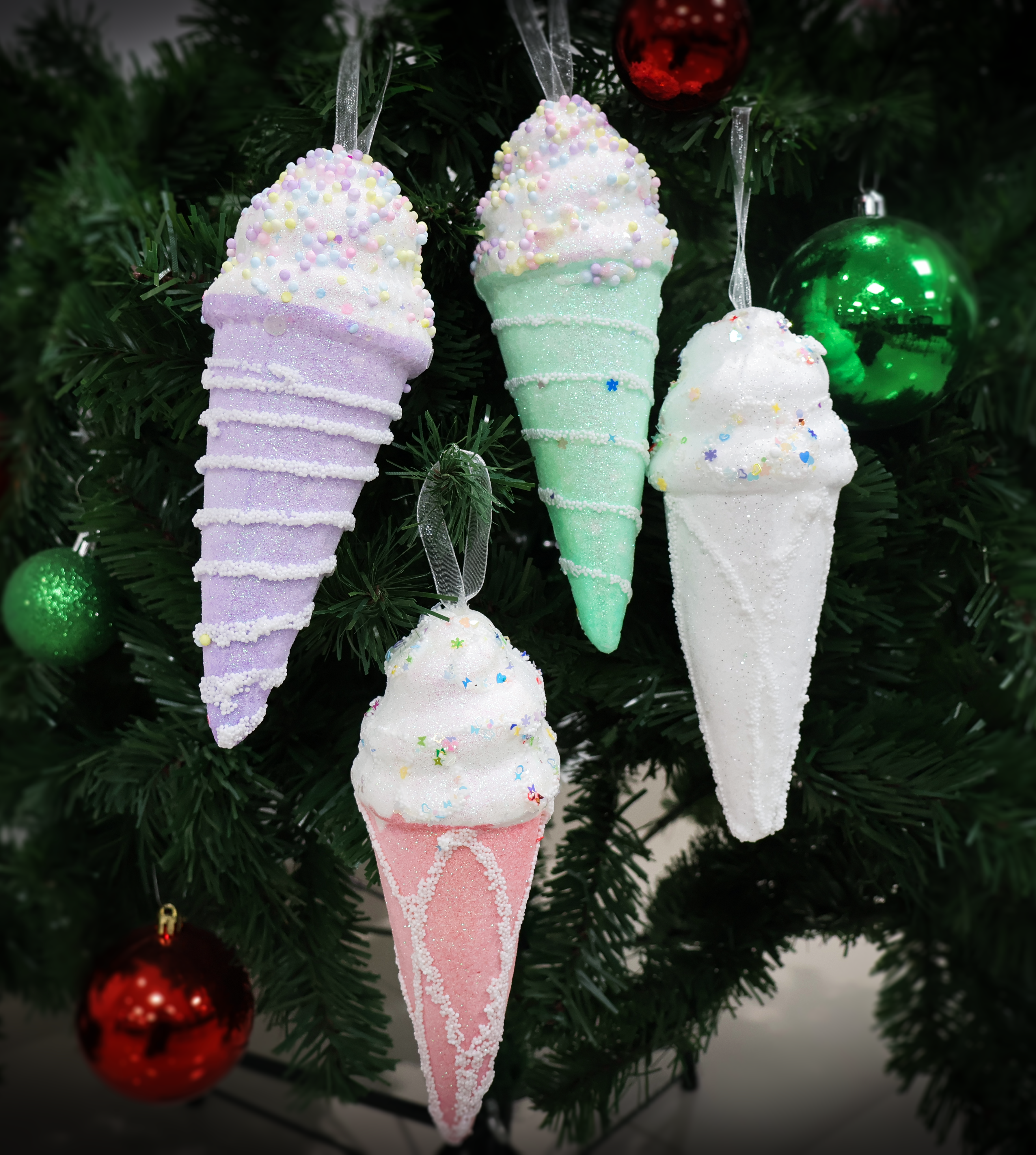 These dazzling pastel colors ice cream cones ornaments are perfect for a unique Christmas tree. Can be also used for floral arrangement, holiday centerpieces, New Year events, weddings or for any home decor. Your candy theme Christmas tree will be complete with these beautiful, glittered ice cream cones that comes in four (4) pastels colors: White, Lilac, Green and Pink.