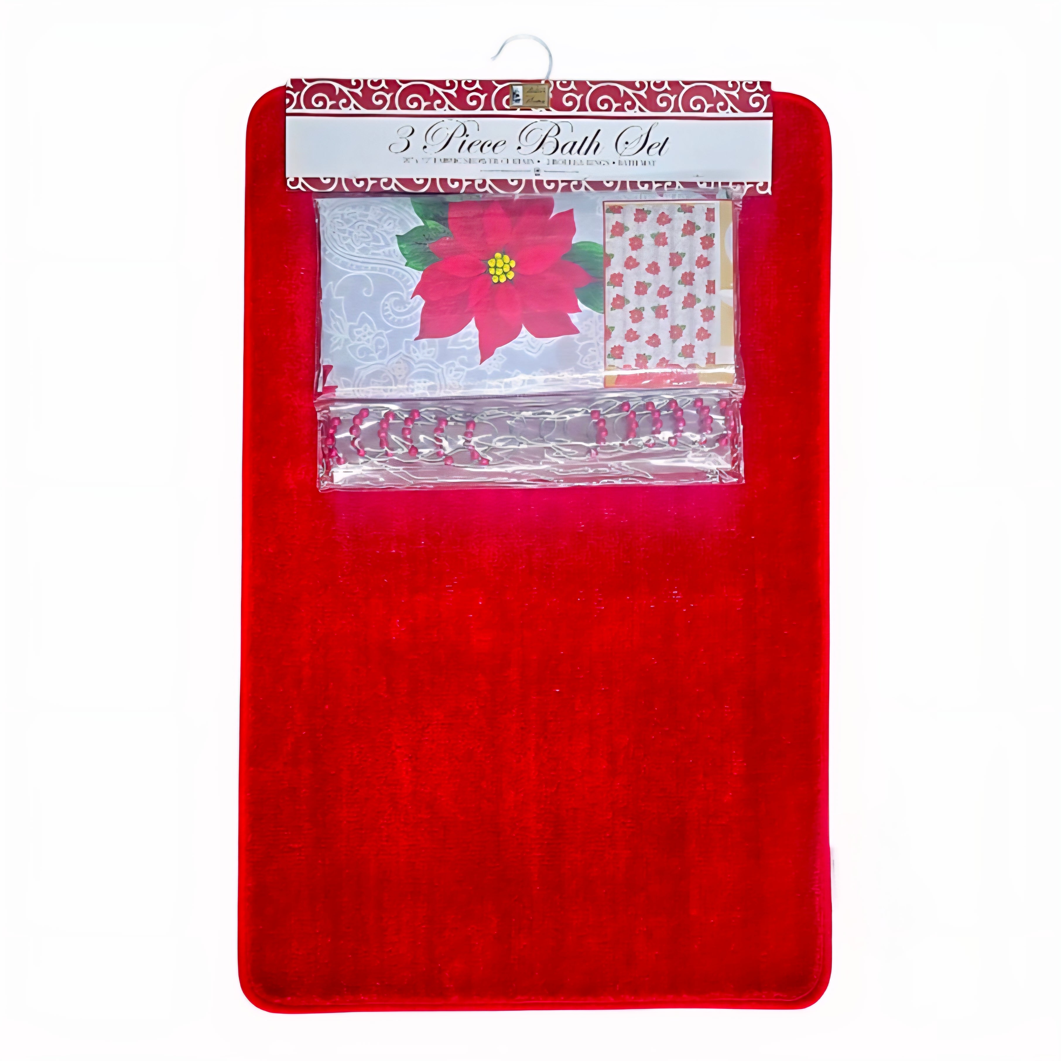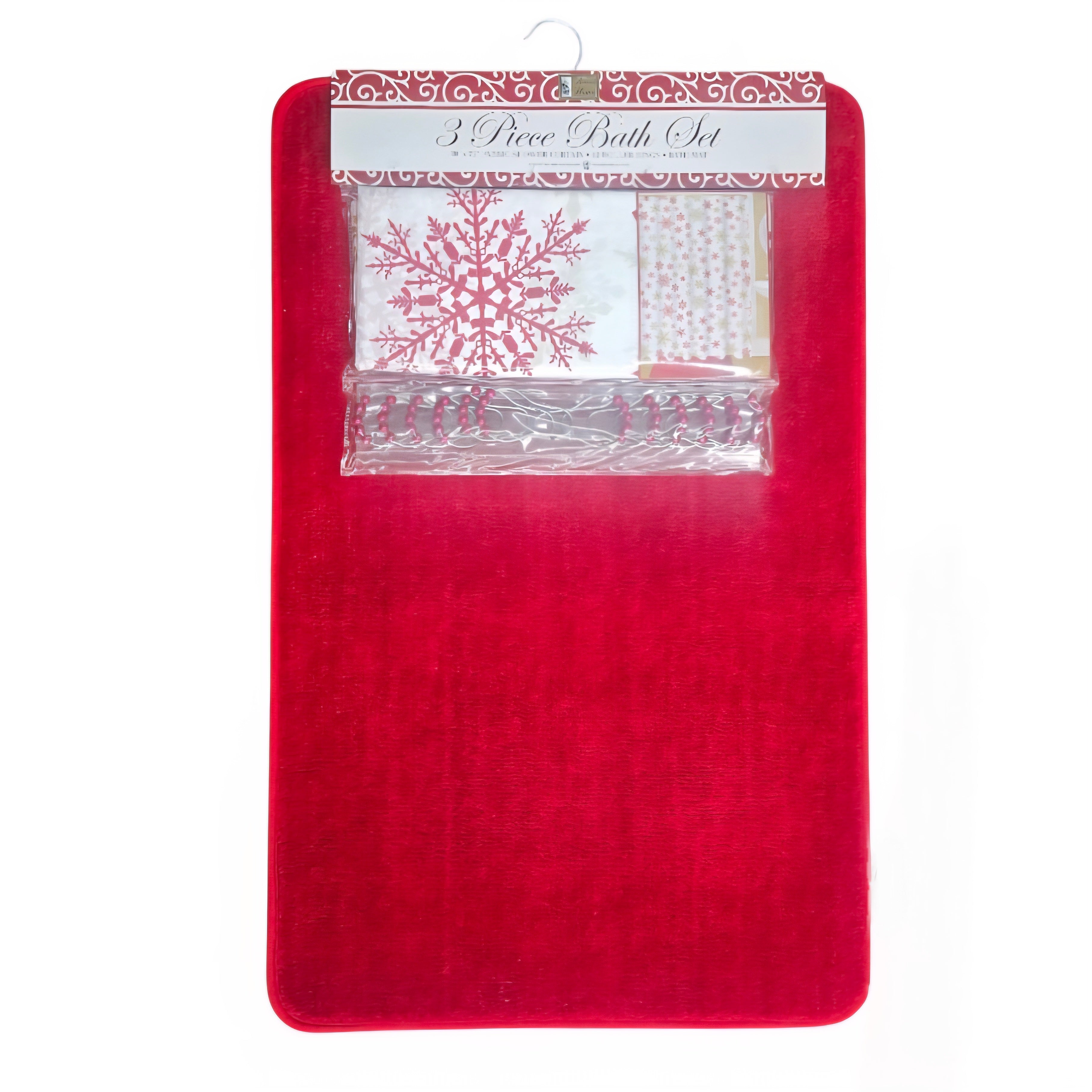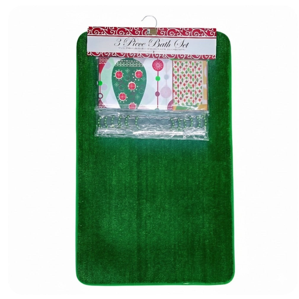 3-piece set includes: shower curtain, 12 hooks and bathroom rug.