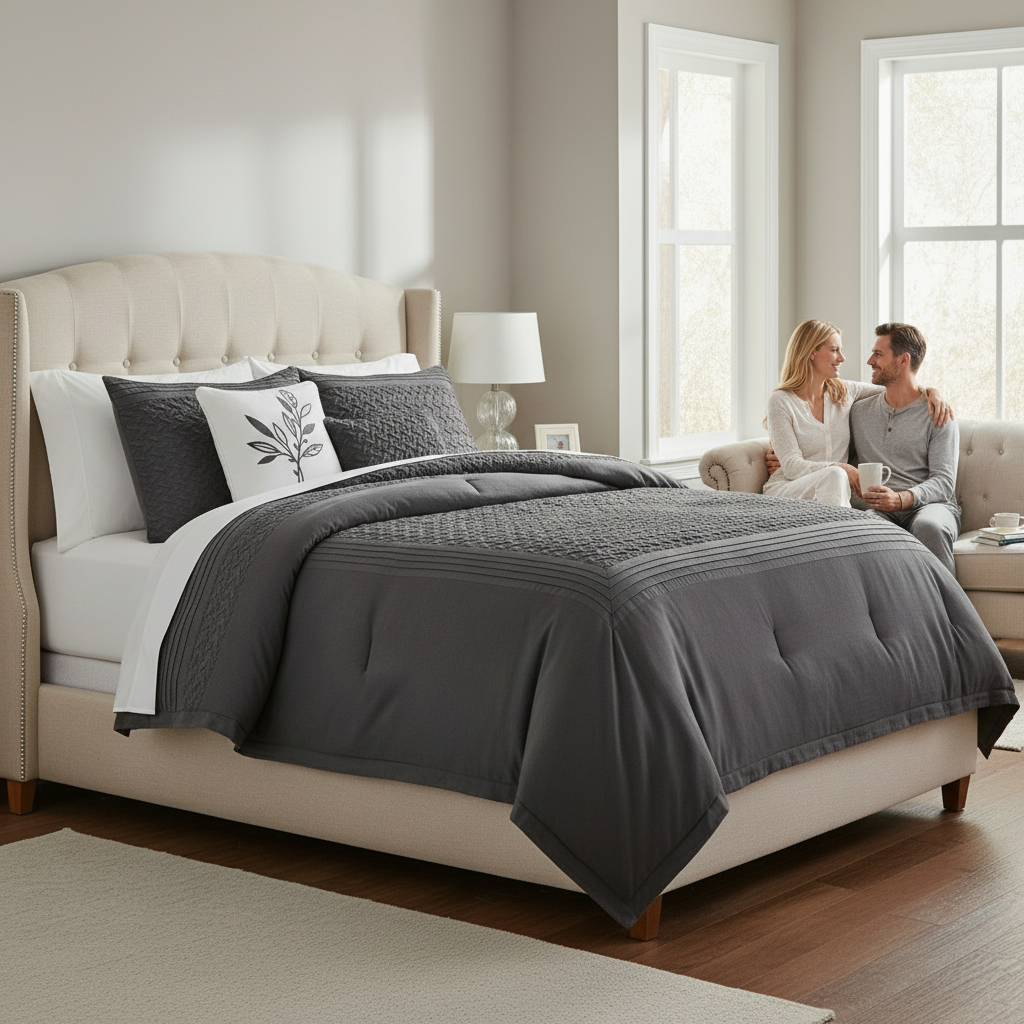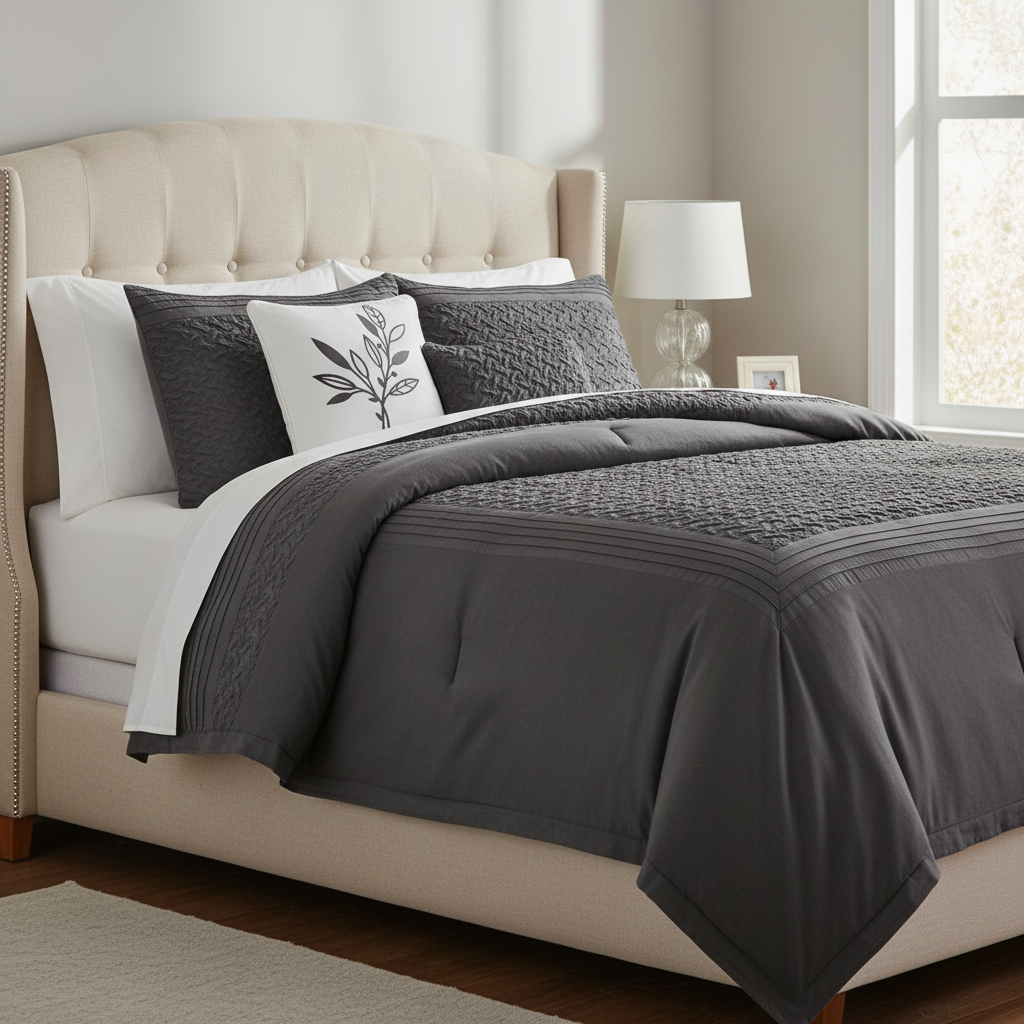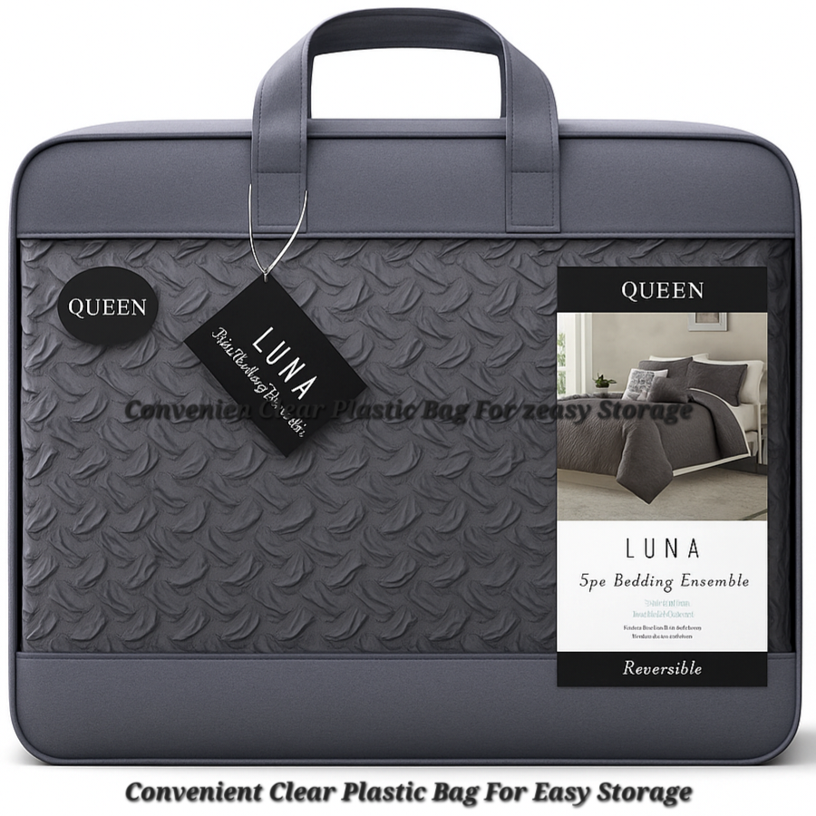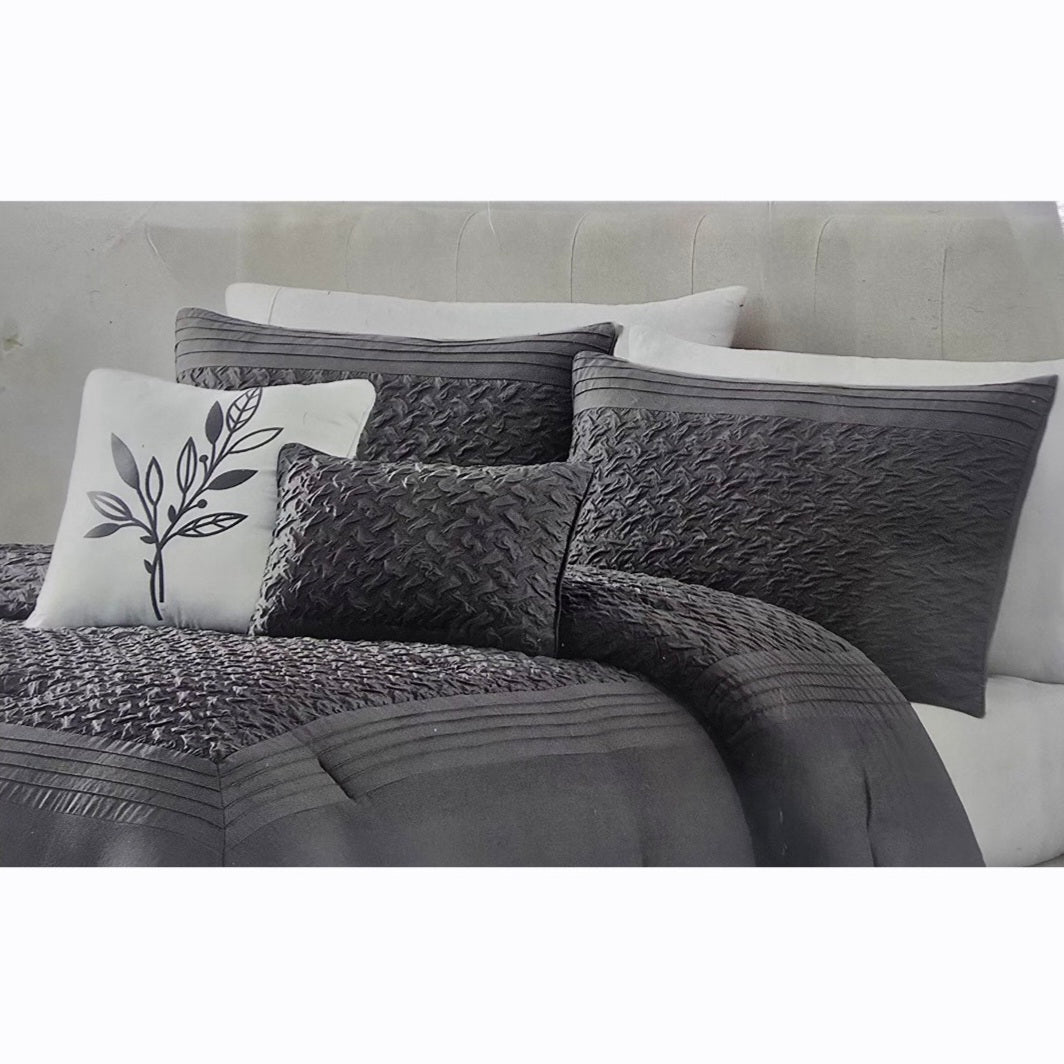 Elegant 5 pieces charcoal gray comforter set. 100% polyester, soft fabric and luxurious. Comes in a plastic bag for easy storage.