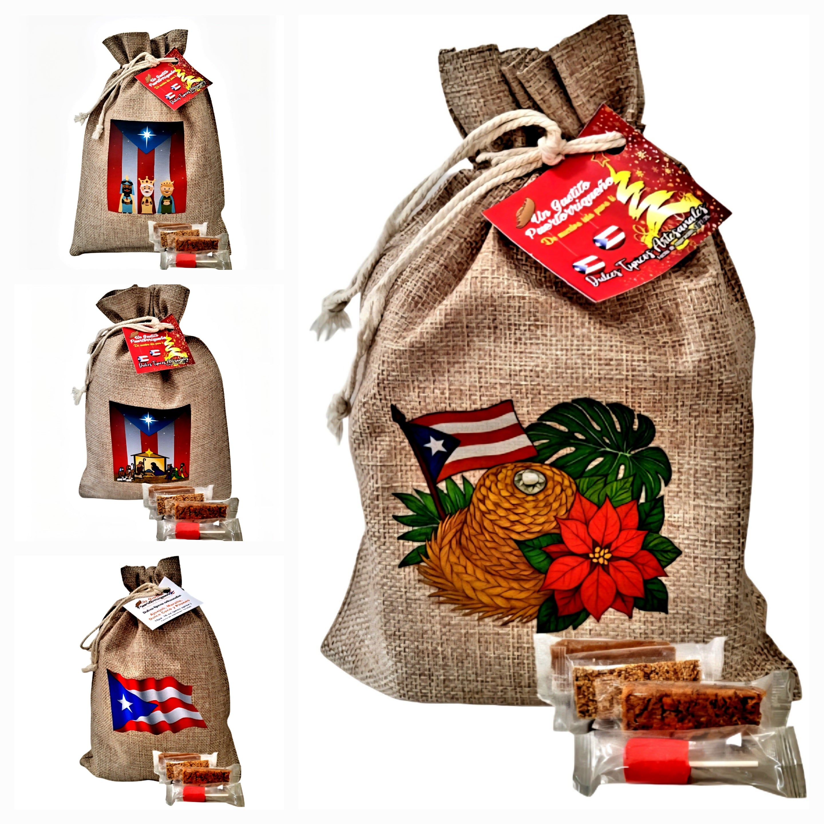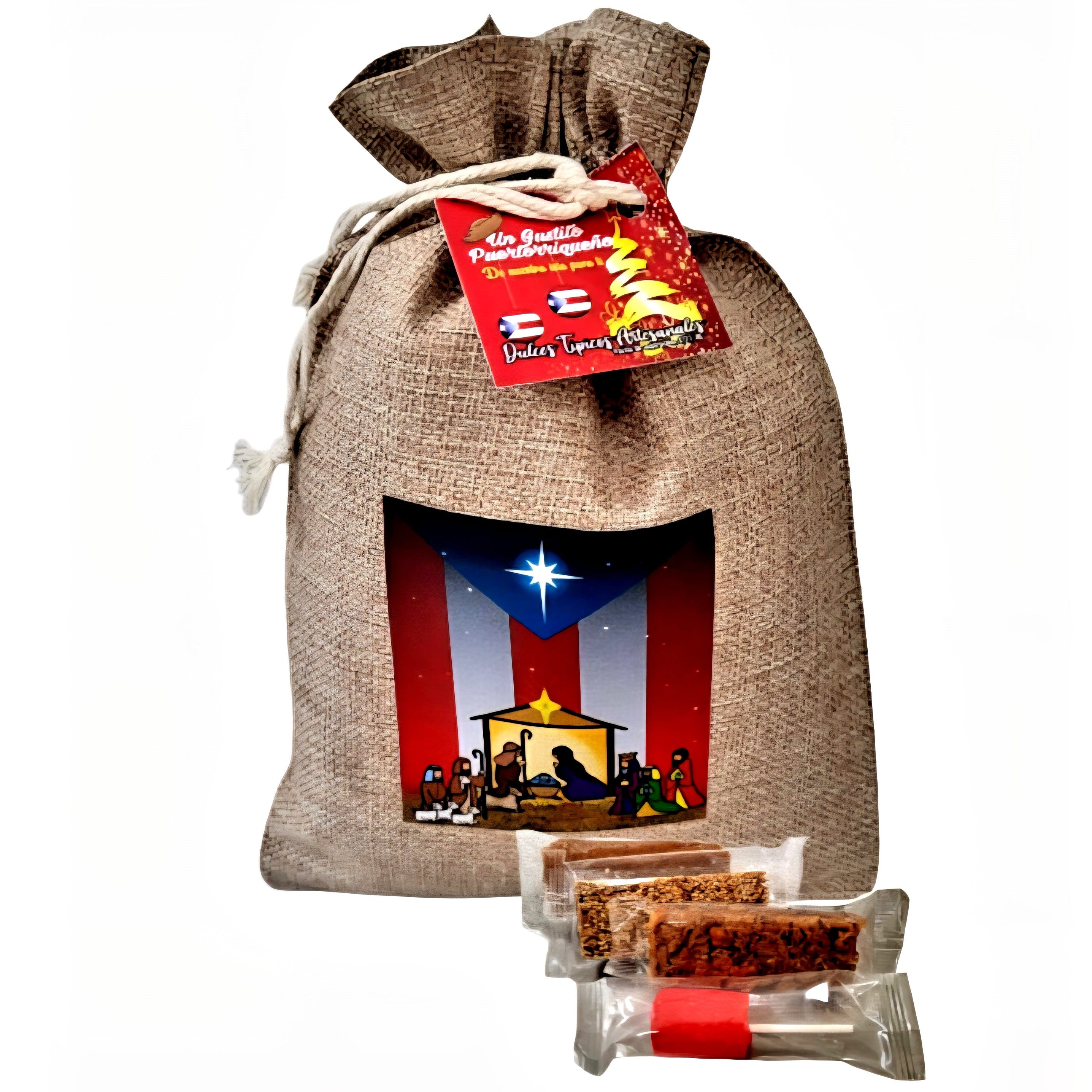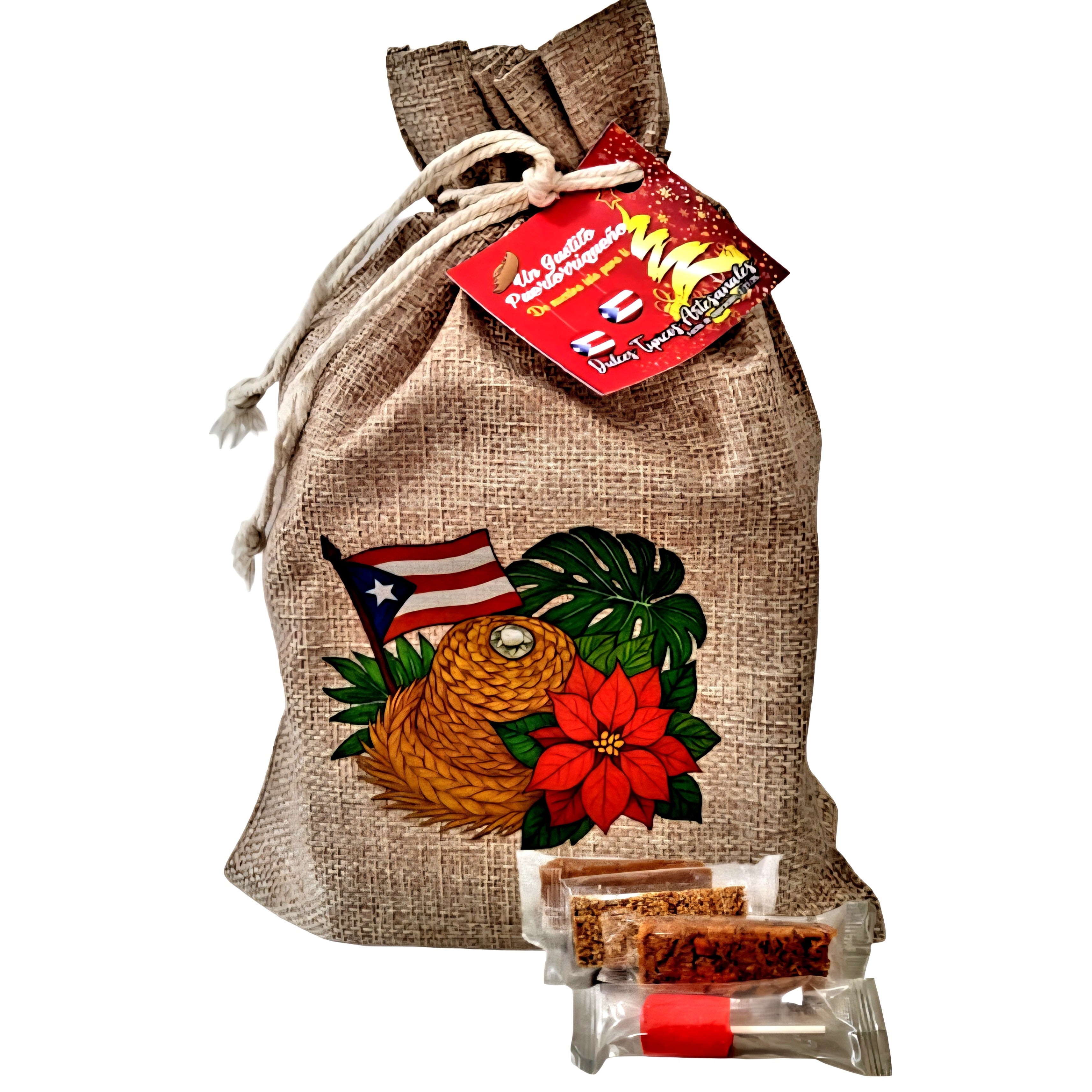 Sweeten your Christmas and the Holidays of your loved ones, with this special gift that will delight everyone. A beautiful burlap sack filled with traditional artisanal sweets made 100% in Puerto Rico. Various designs to choose from. Available in two (2) convenient sizes:
