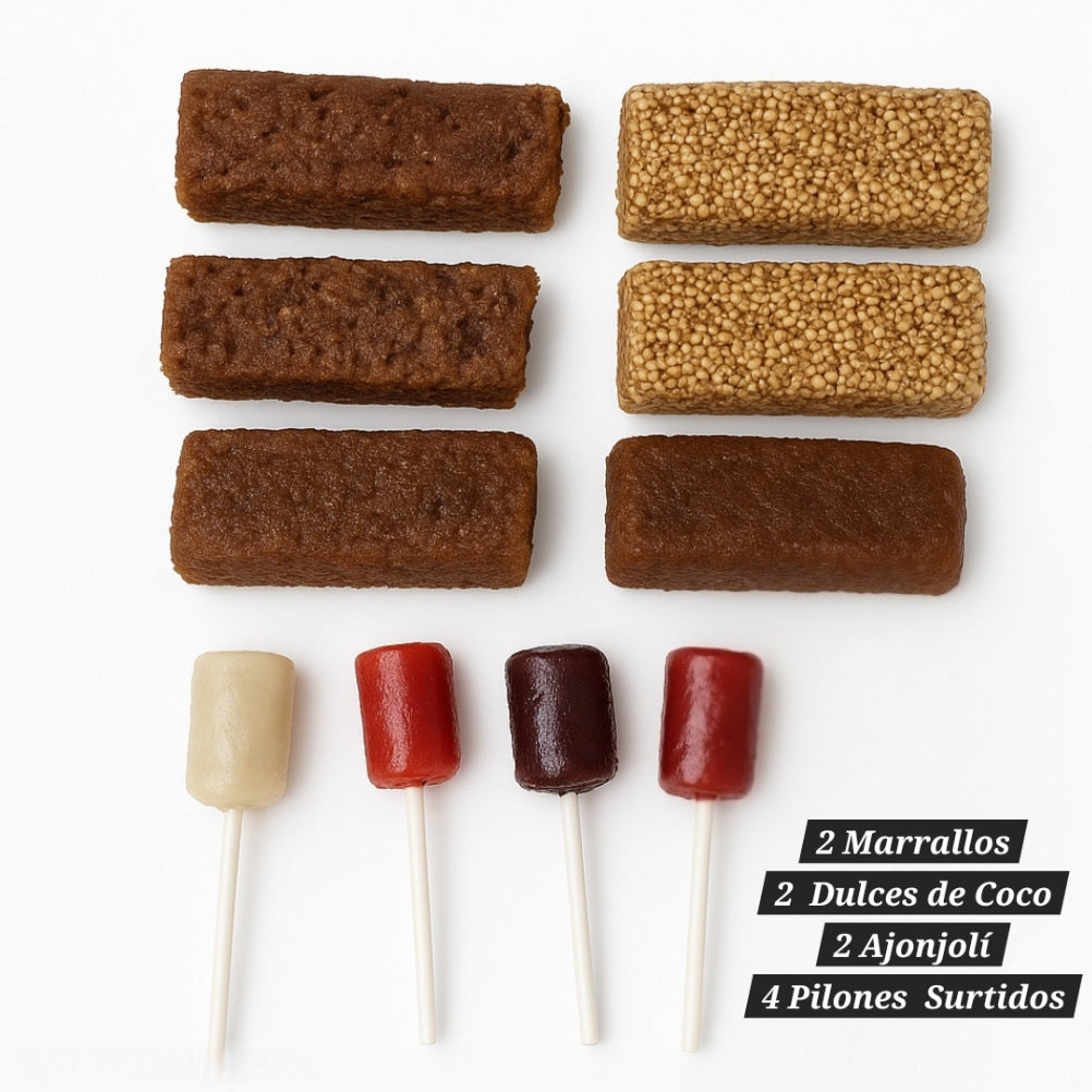 9" Bag with 10 Sweets - Available designs: Puerto Rican Flag, Nativity Scene, The Three Kings, and Pava. Contains: 2 sesame candies, 4 marrallos, 2 sesame pilones, 1 coconut candy pilón, and 1 pilón.