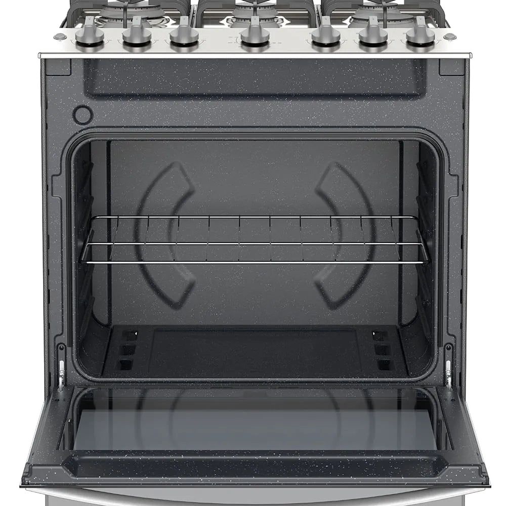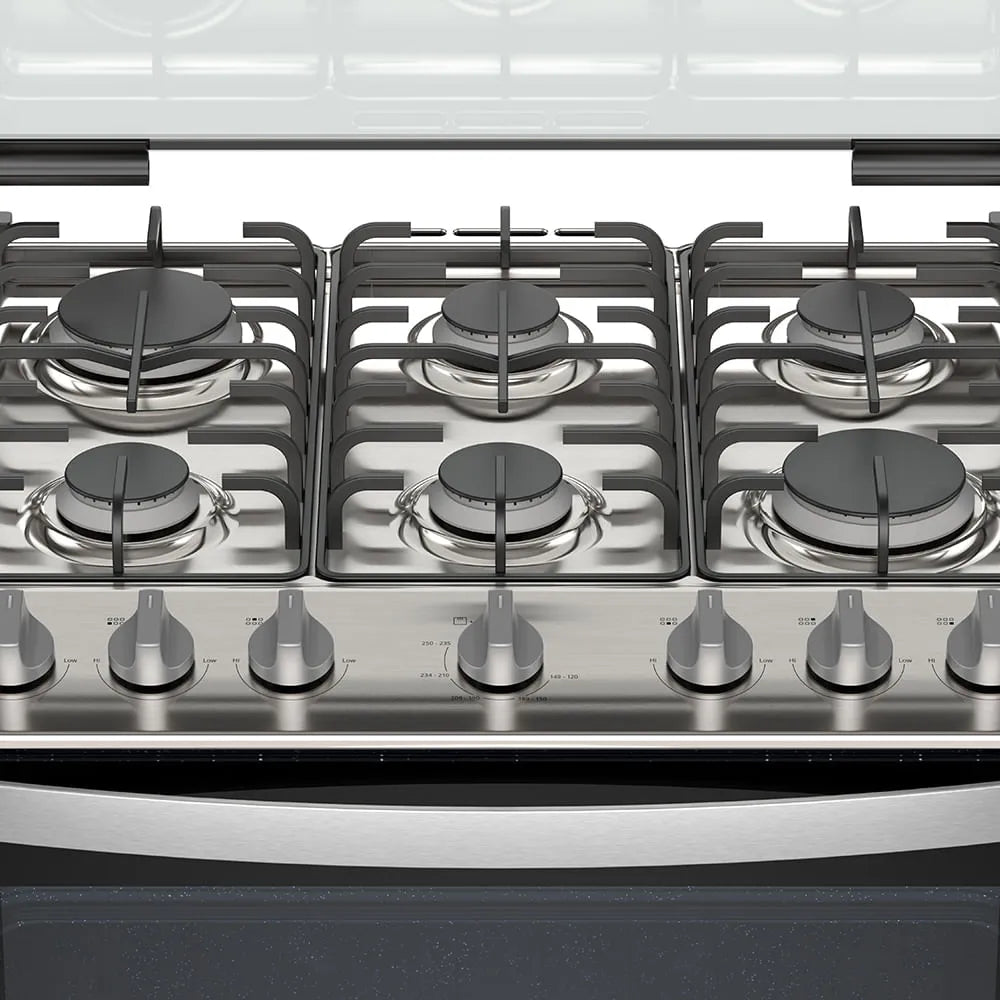 30 In. 5.1 cu. ft. Freestanding Gas Range in Silver with Stainless Steel cover. An ideal range with 6-standard burners. Push and turn button ignition, a Thermogrades Oven with a transparent Panoramic Window, and Door Stop System and EvenClean technology with extra-large window for a better view while baking. This freestanding range is an excellent option for your kitchen.