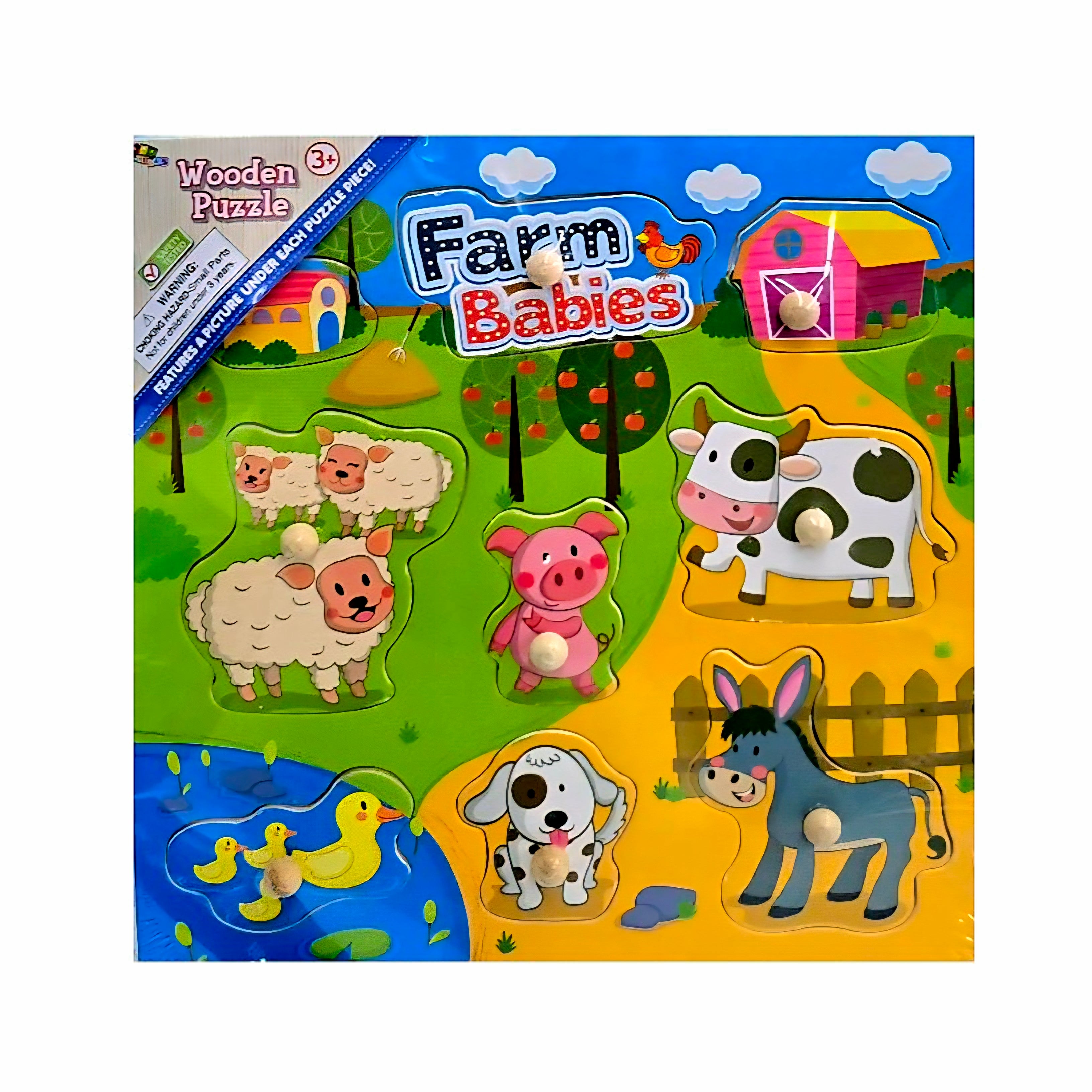 A beautifully illustrated wooden tray puzzle containing 8 pegged pieces.