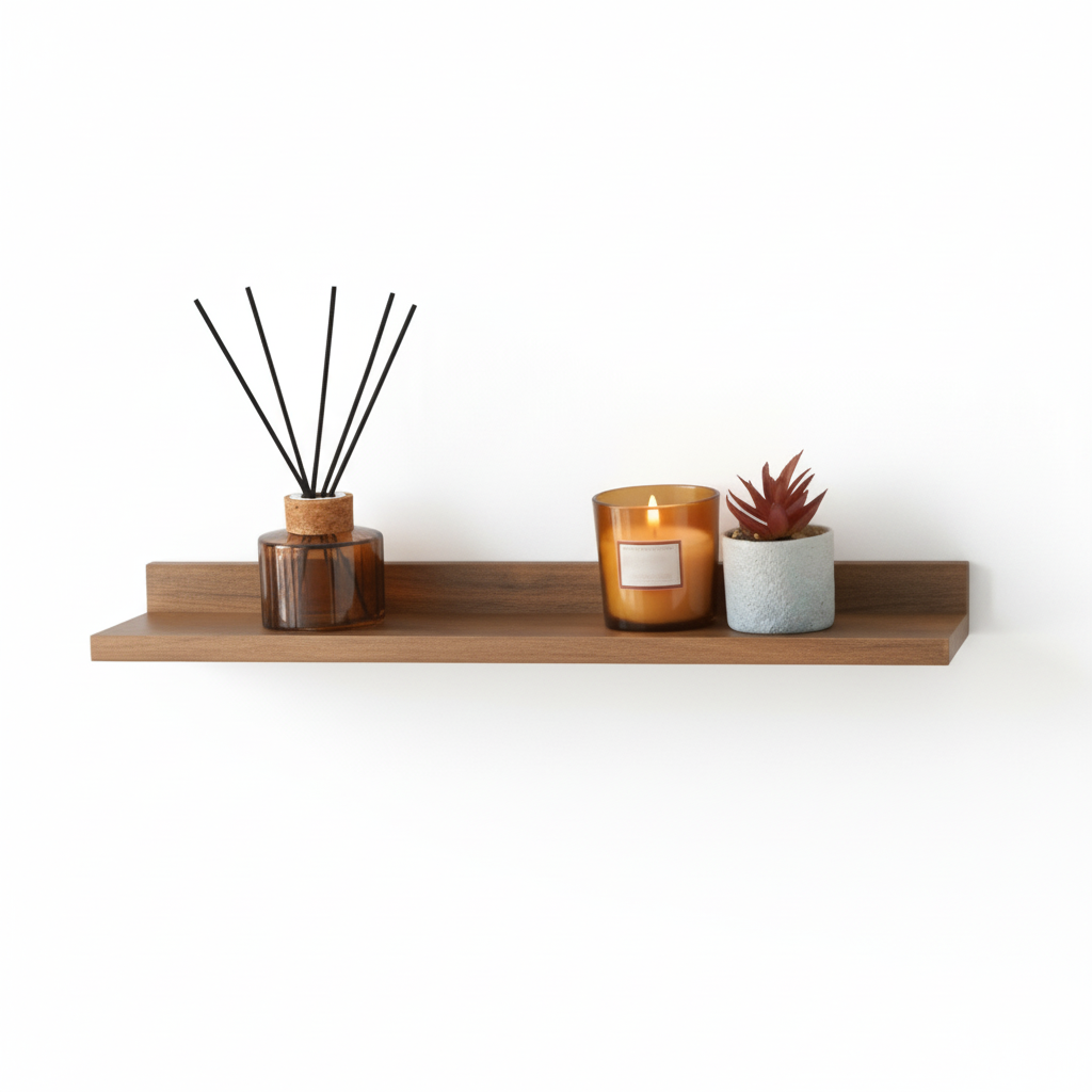 The floating shelf is made entirely of beautiful, pressed wood. It features a reinforced mounting bracket, sturdy enough to support weight.